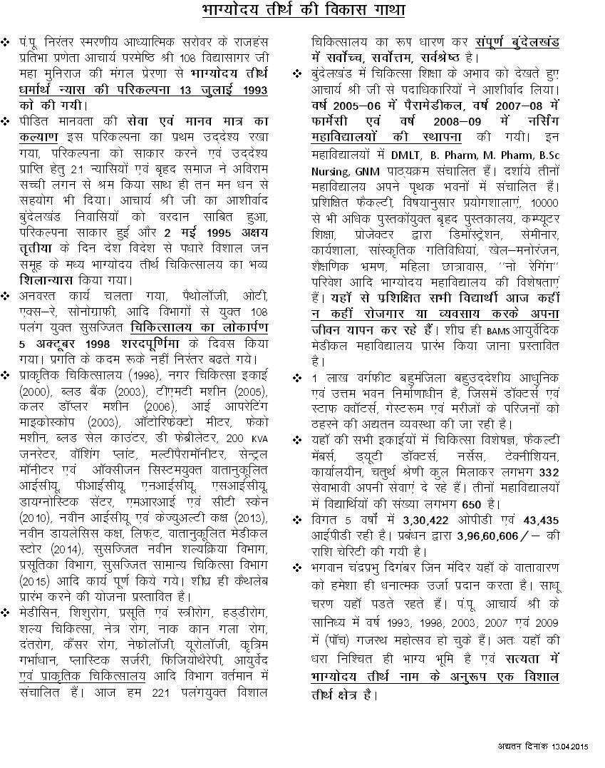 Bhagyoday Tirth Charitable Trust was established in 1993, under the pious direction and blessing of Param Pujya Acharya Shri 108 Vidyasagar Ji Maharaj. Since the inception, the Trust is nurtured by the sacred heart of Acharya Shri to fulfill the objective of serving the diseased mankind. The Bhagyoday Tirth Charitable Hospital is providing state of the art Medical facilities to economically weaker section of the Society through last 12 Years. The Trust also started Naturopathy and Ayurvedic department to develop and nourish the Indian system of Medicine and to provide the cost effective alternate to the diseased mankind, Trust is recognized for its value driven services to economically and socially backward area of the State, the Bundelkhand region.